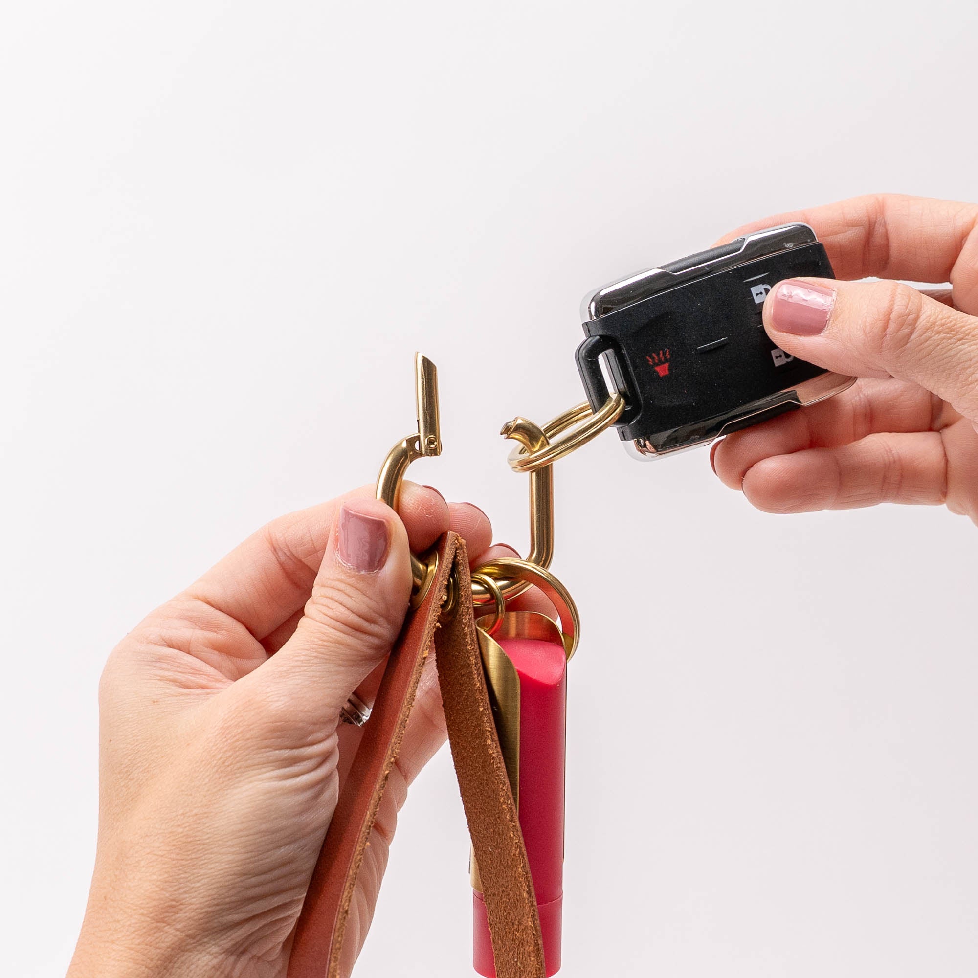 Our Signature Locking Keyring is simple and secure—pull down to swing open, add or remove your keys and fobs, then click it closed to keep everything locked in place.