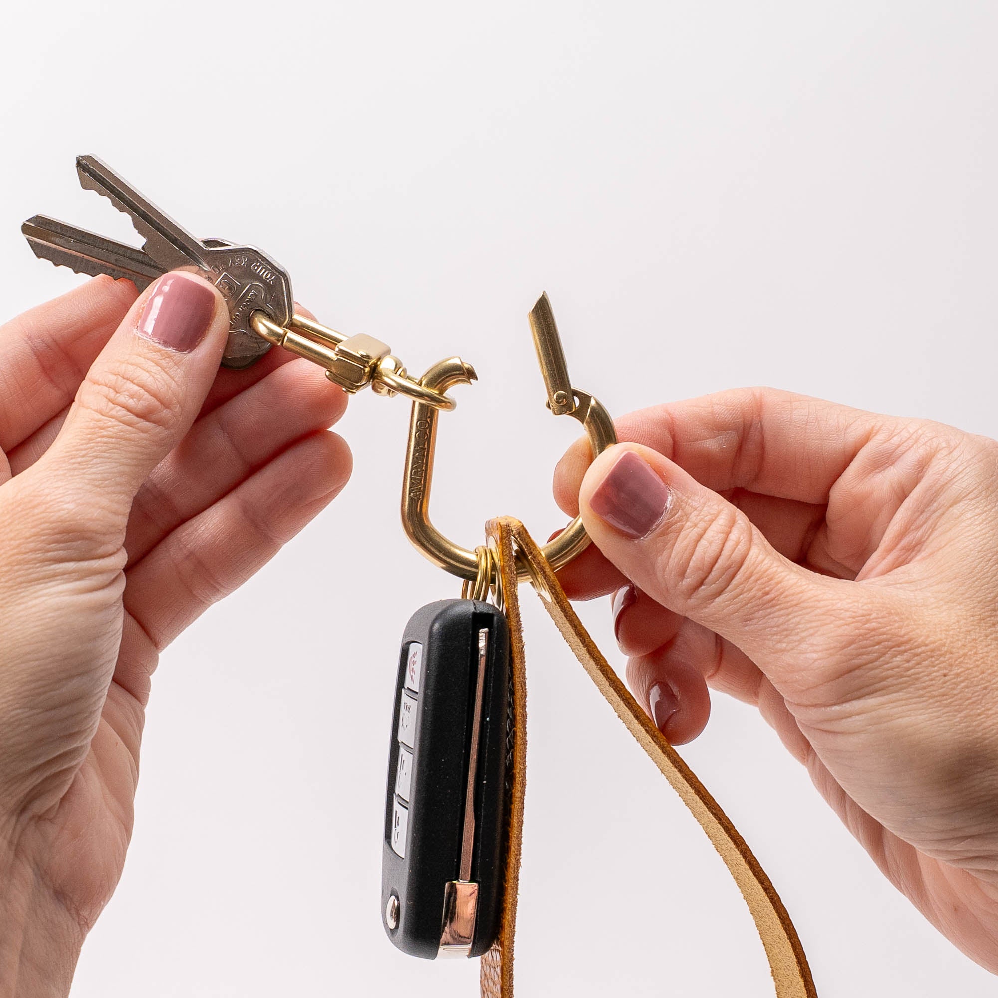 Our Signature Locking Keyring is simple and secure—pull down to swing open, add or remove your keys and fobs, then click it closed to keep everything locked in place.