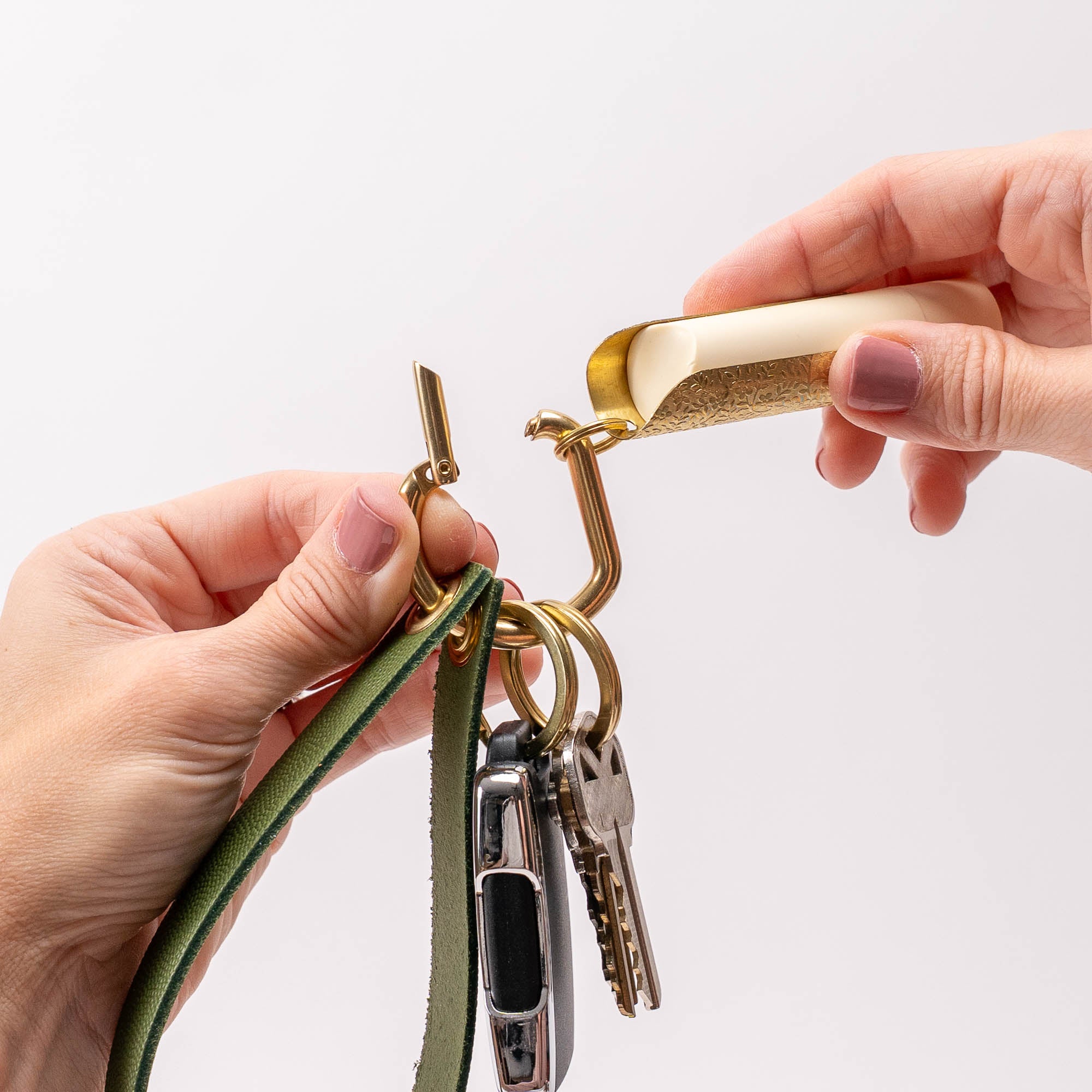 Our Signature Locking Keyring is simple and secure—pull down to swing open, add or remove your keys and fobs, then click it closed to keep everything locked in place.